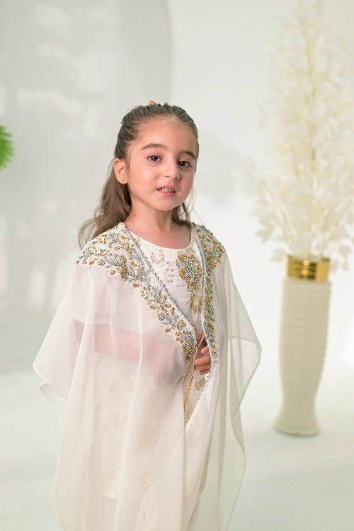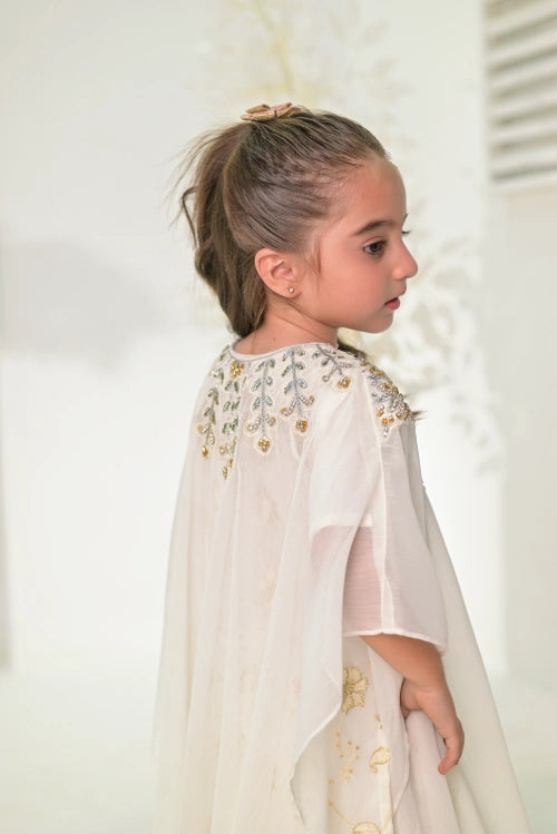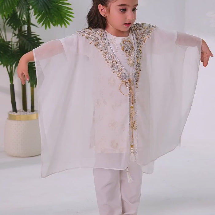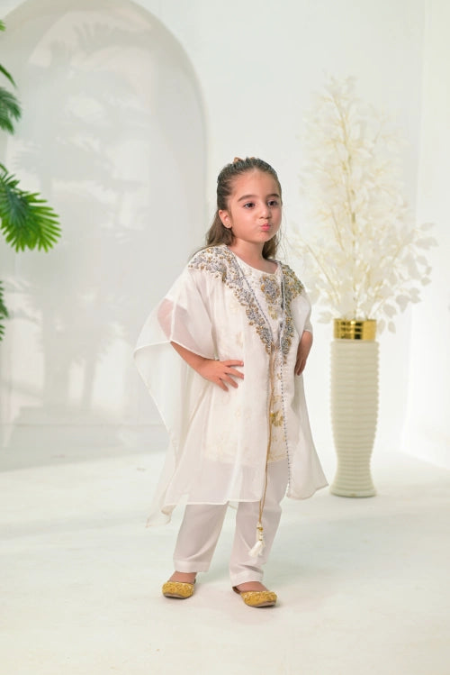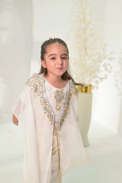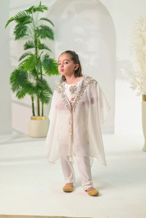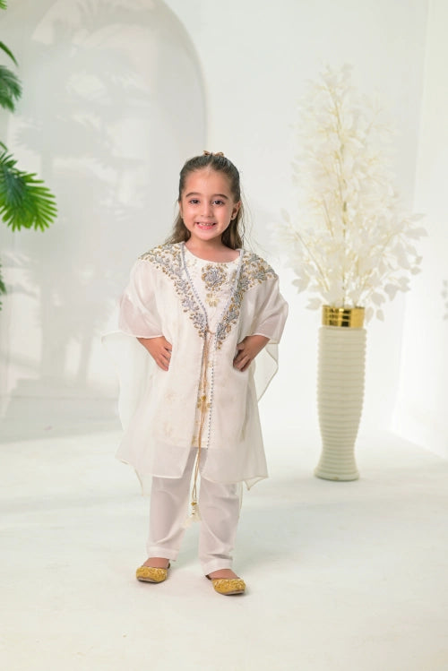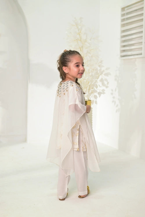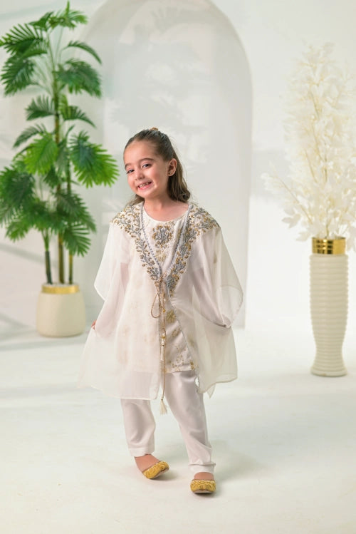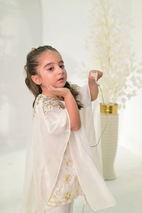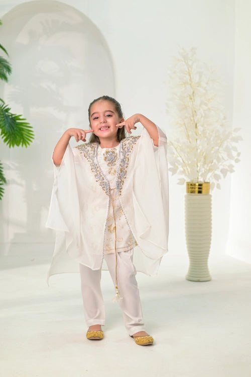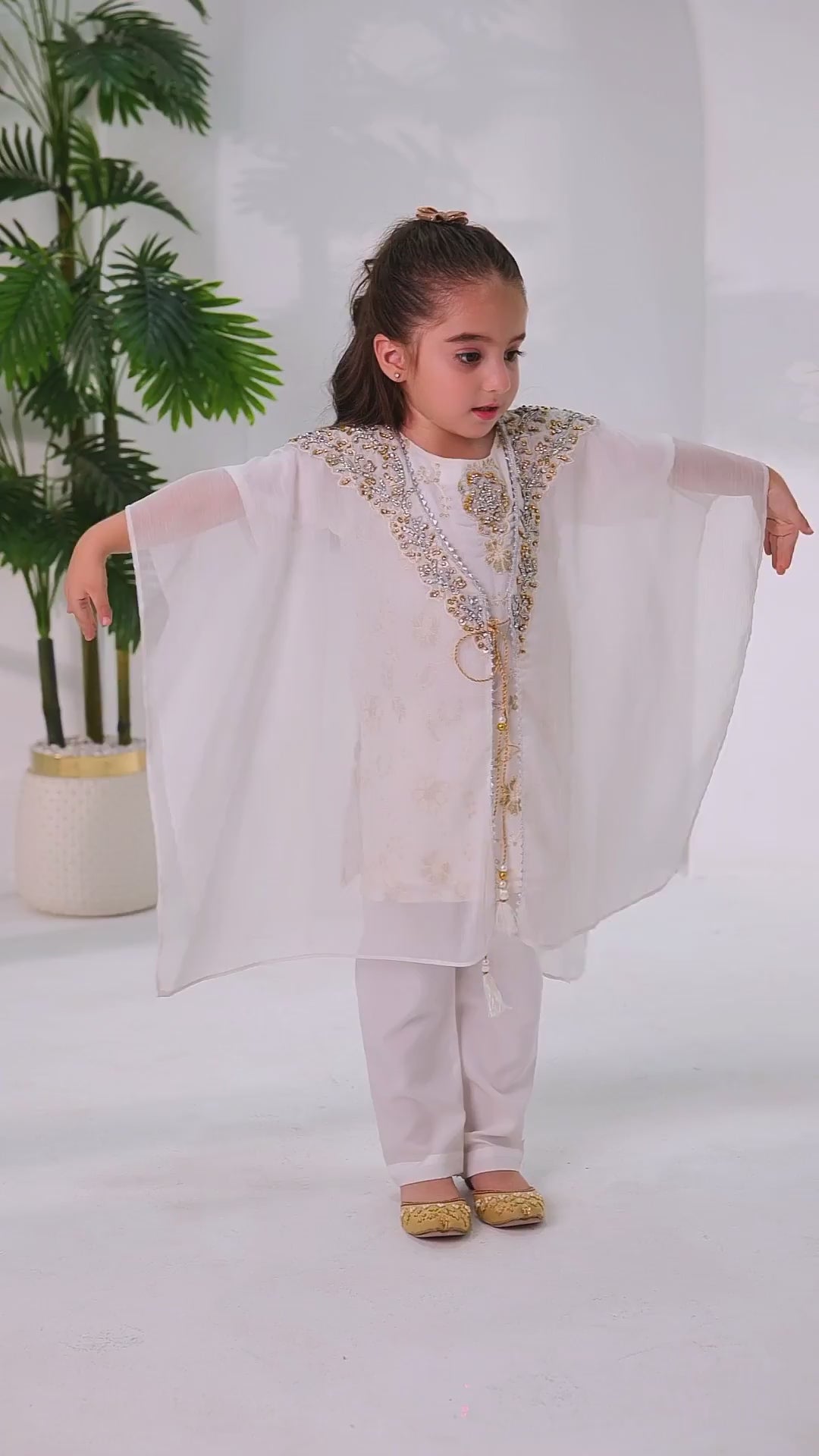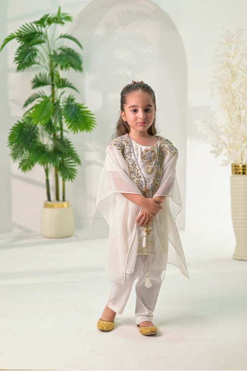 where elegance meets purity. A perfect 3 piece white dress to elevate your festive vibe. Elegant golden zari work for the shirt underneath and to complement the look even more follows a beautiful lightly zari worked shrug and straight pant trousers that turns this attire into a classic masterpiece.